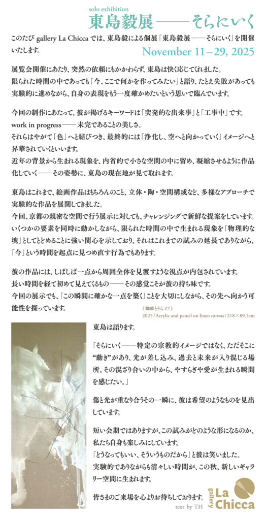 このたび gallery La Chicca では、東島毅による個展「東島毅展──そらにいく」を開催いたします。